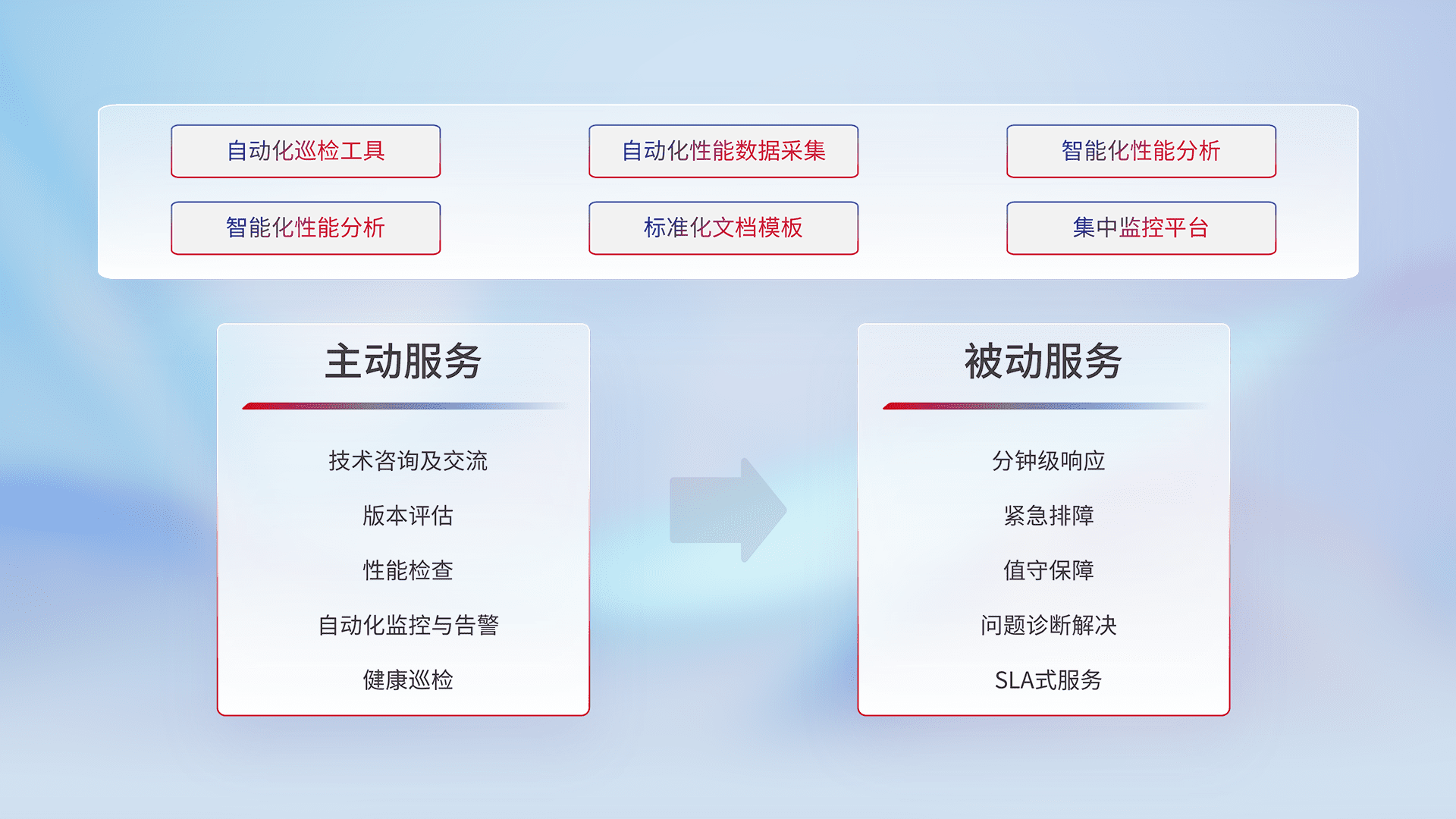 智能化工具和标准化文档,,保障服务质量,,提供主动服务(包含技术咨询、、、版本评估、、、性能检查、、自动化监控与告警、、健康巡检)和被动服务包含(分钟级响应、、紧急排障、、值守保障、、、问题诊断解决、、、、SLA服务)。。